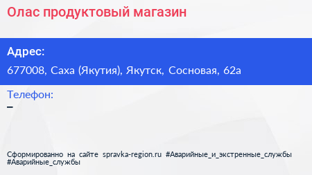 Олас, продуктовый магазин по адресу 677008, Саха (Якутия), Якутск, Сосновая, 62а в дальнейшем Организация, размещена в следующих категориях: