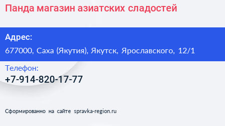 Панда, магазин азиатских сладостей по адресу 677000, Саха (Якутия), Якутск, Ярославского, 12/1 в дальнейшем Организация, размещена в следующих категориях: