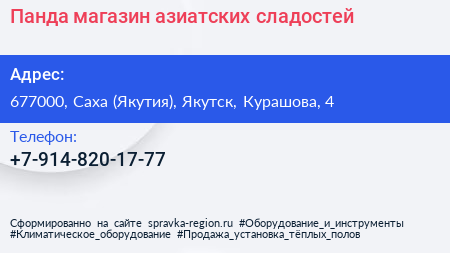 Панда, магазин азиатских сладостей по адресу 677000, Саха (Якутия), Якутск, Курашова, 4 в дальнейшем Организация, размещена в следующих категориях: