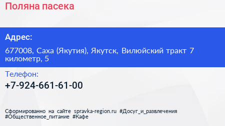 Поляна, пасека по адресу 677008, Саха (Якутия), Якутск, Вилюйский тракт 7 километр, 5 в дальнейшем Организация, размещена в следующих категориях: