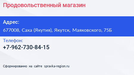 Продовольственный магазин по адресу 677008, Саха (Якутия), Якутск, Маяковского, 75Б в дальнейшем Организация, размещена в следующих категориях: