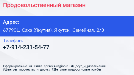 Продовольственный магазин по адресу 677901, Саха (Якутия), Якутск, Семейная, 2/3 в дальнейшем Организация, размещена в следующих категориях: