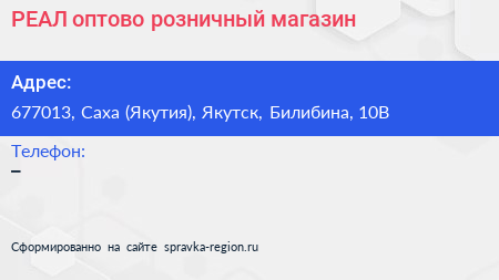 РЕАЛ, оптово-розничный магазин по адресу 677013, Саха (Якутия), Якутск, Билибина, 10В в дальнейшем Организация, размещена в следующих категориях: