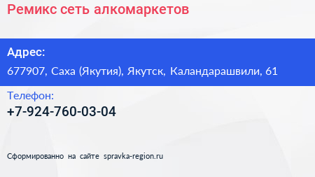 Ремикс, сеть алкомаркетов по адресу 677907, Саха (Якутия), Якутск, Каландарашвили, 61 в дальнейшем Организация, размещена в следующих категориях: