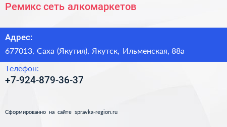 Ремикс, сеть алкомаркетов по адресу 677013, Саха (Якутия), Якутск, Ильменская, 88а в дальнейшем Организация, размещена в следующих категориях: