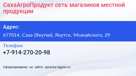 СахаАгроПродукт, сеть магазинов местной продукции по адресу 677014, Саха (Якутия), Якутск, Можайского, 29 в дальнейшем Организация, размещена в следующих категориях: