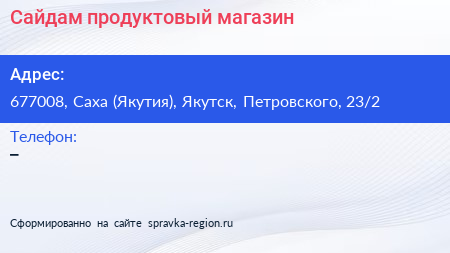 Сайдам, продуктовый магазин по адресу 677008, Саха (Якутия), Якутск, Петровского, 23/2 в дальнейшем Организация, размещена в следующих категориях: