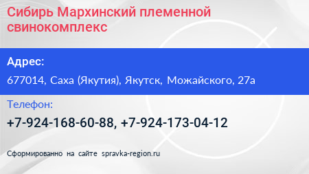 Сибирь, Мархинский племенной свинокомплекс по адресу 677014, Саха (Якутия), Якутск, Можайского, 27а в дальнейшем Организация, размещена в следующих категориях: