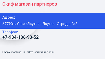 Скиф, магазин партнеров по адресу 677901, Саха (Якутия), Якутск, Строда, 3/3 в дальнейшем Организация, размещена в следующих категориях: