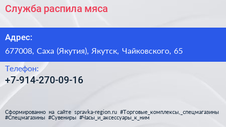 Служба распила мяса по адресу 677008, Саха (Якутия), Якутск, Чайковского, 65 в дальнейшем Организация, размещена в следующих категориях: