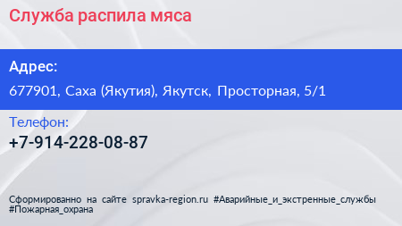 Служба распила мяса по адресу 677901, Саха (Якутия), Якутск, Просторная, 5/1 в дальнейшем Организация, размещена в следующих категориях: