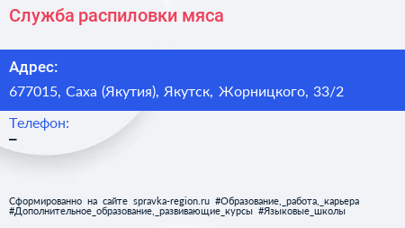 Служба распиловки мяса по адресу 677015, Саха (Якутия), Якутск, Жорницкого, 33/2 в дальнейшем Организация, размещена в следующих категориях: