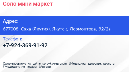 Соло, мини-маркет по адресу 677008, Саха (Якутия), Якутск, Лермонтова, 92/2а в дальнейшем Организация, размещена в следующих категориях: