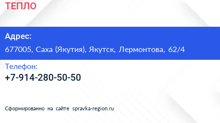 ТЕПЛО по адресу 677005, Саха (Якутия), Якутск, Лермонтова, 62/4 в дальнейшем Организация, размещена в следующих категориях: