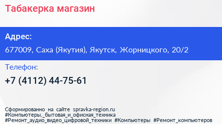 Табакерка, магазин по адресу 677009, Саха (Якутия), Якутск, Жорницкого, 20/2 в дальнейшем Организация, размещена в следующих категориях: