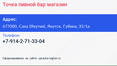 Точка, пивной бар-магазин по адресу 677000, Саха (Якутия), Якутск, Губина, 35/1а в дальнейшем Организация, размещена в следующих категориях: