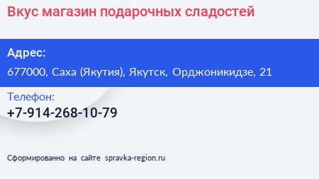 Вкус, магазин подарочных сладостей по адресу 677000, Саха (Якутия), Якутск, Орджоникидзе, 21 в дальнейшем Организация, размещена в следующих категориях: