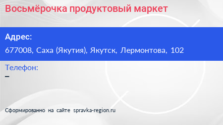 Восьмёрочка, продуктовый маркет по адресу 677008, Саха (Якутия), Якутск, Лермонтова, 102 в дальнейшем Организация, размещена в следующих категориях: