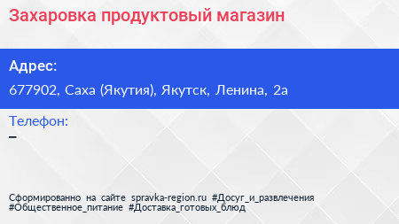 Захаровка, продуктовый магазин по адресу 677902, Саха (Якутия), Якутск, Ленина, 2а в дальнейшем Организация, размещена в следующих категориях: