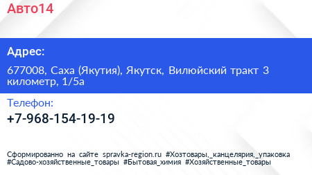 Авто14 по адресу 677008, Саха (Якутия), Якутск, Вилюйский тракт 3 километр, 1/5а в дальнейшем Организация, размещена в следующих категориях: