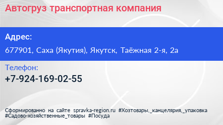 Автогруз, транспортная компания по адресу 677901, Саха (Якутия), Якутск, Таёжная 2-я, 2а в дальнейшем Организация, размещена в следующих категориях: