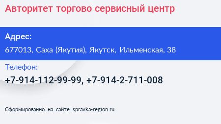 Авторитет, торгово-сервисный центр по адресу 677013, Саха (Якутия), Якутск, Ильменская, 38 в дальнейшем Организация, размещена в следующих категориях: