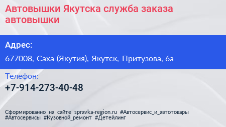 Автовышки Якутска, служба заказа автовышки по адресу 677008, Саха (Якутия), Якутск, Притузова, 6а в дальнейшем Организация, размещена в следующих категориях: