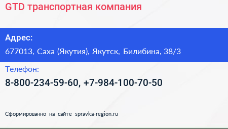 GTD, транспортная компания по адресу 677013, Саха (Якутия), Якутск, Билибина, 38/3 в дальнейшем Организация, размещена в следующих категориях: