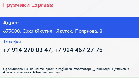Грузчики Express по адресу 677000, Саха (Якутия), Якутск, Пояркова, 8 в дальнейшем Организация, размещена в следующих категориях: