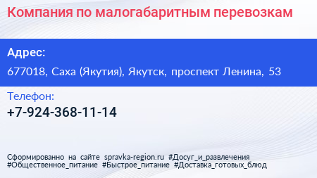 Компания по малогабаритным перевозкам по адресу 677018, Саха (Якутия), Якутск, проспект Ленина, 53 в дальнейшем Организация, размещена в следующих категориях: