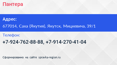 Пантера по адресу 677014, Саха (Якутия), Якутск, Мицкевича, 39/1 в дальнейшем Организация, размещена в следующих категориях: