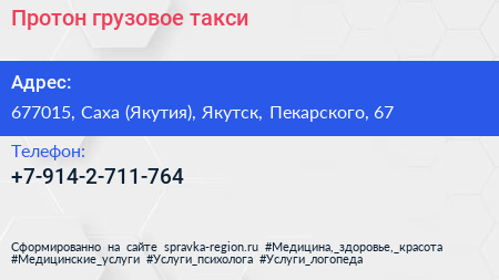 Протон, грузовое такси по адресу 677015, Саха (Якутия), Якутск, Пекарского, 67 в дальнейшем Организация, размещена в следующих категориях: