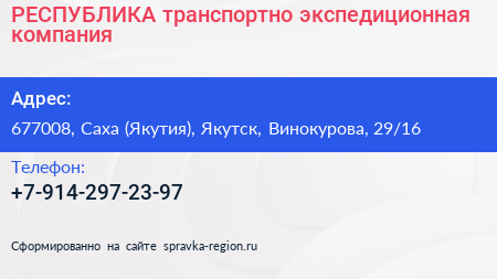 РЕСПУБЛИКА, транспортно-экспедиционная компания по адресу 677008, Саха (Якутия), Якутск, Винокурова, 29/16 в дальнейшем Организация, размещена в следующих категориях: