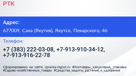 РТК по адресу 677009, Саха (Якутия), Якутск, Пекарского, 46 в дальнейшем Организация, размещена в следующих категориях: