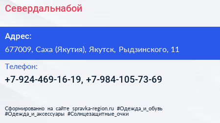 Севердальнабой по адресу 677009, Саха (Якутия), Якутск, Рыдзинского, 11 в дальнейшем Организация, размещена в следующих категориях: