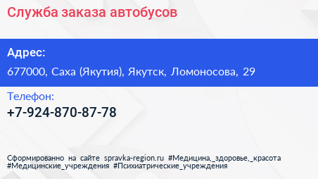 Служба заказа автобусов по адресу 677000, Саха (Якутия), Якутск, Ломоносова, 29 в дальнейшем Организация, размещена в следующих категориях: