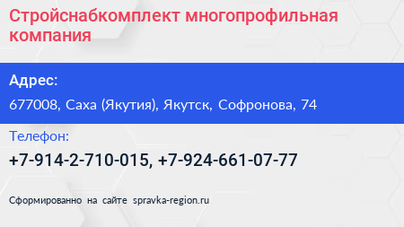 Стройснабкомплект, многопрофильная компания по адресу 677008, Саха (Якутия), Якутск, Софронова, 74 в дальнейшем Организация, размещена в следующих категориях: