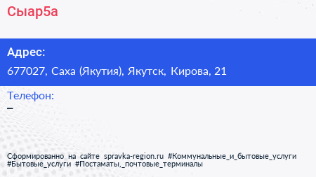 Сыар5а по адресу 677027, Саха (Якутия), Якутск, Кирова, 21 в дальнейшем Организация, размещена в следующих категориях: