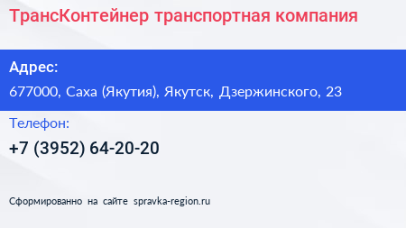 ТрансКонтейнер, транспортная компания по адресу 677000, Саха (Якутия), Якутск, Дзержинского, 23 в дальнейшем Организация, размещена в следующих категориях: