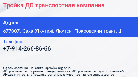 Тройка ДВ, транспортная компания по адресу 677007, Саха (Якутия), Якутск, Покровский тракт, 1г в дальнейшем Организация, размещена в следующих категориях: