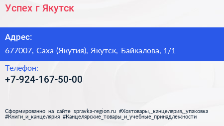 Успех, г. Якутск по адресу 677007, Саха (Якутия), Якутск, Байкалова, 1/1 в дальнейшем Организация, размещена в следующих категориях: