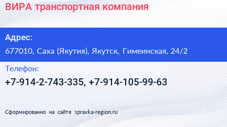 ВИРА, транспортная компания по адресу 677010, Саха (Якутия), Якутск, Гимеинская, 24/2 в дальнейшем Организация, размещена в следующих категориях: