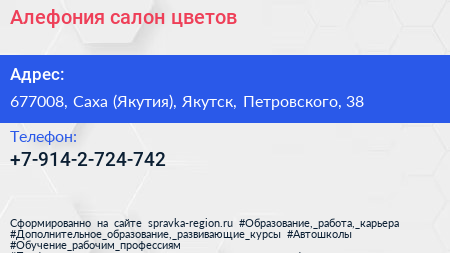 Алефония, салон цветов по адресу 677008, Саха (Якутия), Якутск, Петровского, 38 в дальнейшем Организация, размещена в следующих категориях: