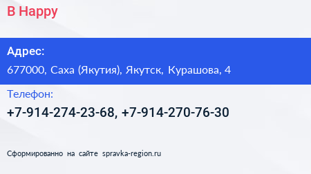 B-Happy по адресу 677000, Саха (Якутия), Якутск, Курашова, 4 в дальнейшем Организация, размещена в следующих категориях: