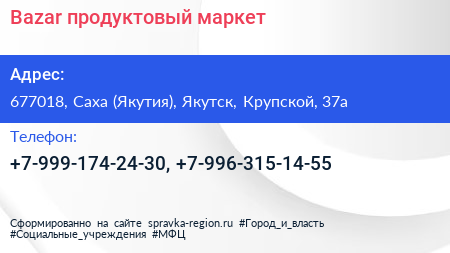 Bazar, продуктовый маркет по адресу 677018, Саха (Якутия), Якутск, Крупской, 37а в дальнейшем Организация, размещена в следующих категориях: