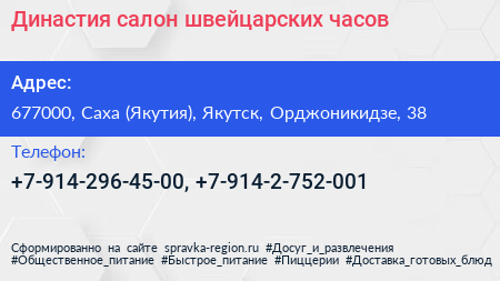 Династия, салон швейцарских часов по адресу 677000, Саха (Якутия), Якутск, Орджоникидзе, 38 в дальнейшем Организация, размещена в следующих категориях: