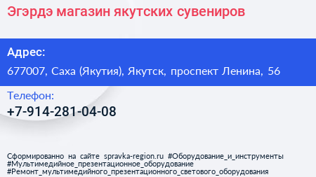 Эгэрдэ, магазин якутских сувениров по адресу 677007, Саха (Якутия), Якутск, проспект Ленина, 56 в дальнейшем Организация, размещена в следующих категориях:
