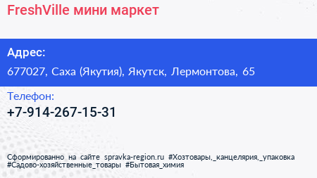 FreshVille, мини-маркет по адресу 677027, Саха (Якутия), Якутск, Лермонтова, 65 в дальнейшем Организация, размещена в следующих категориях: