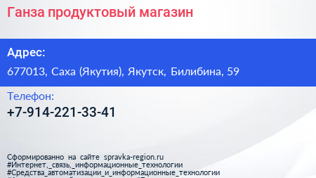 Ганза, продуктовый магазин по адресу 677013, Саха (Якутия), Якутск, Билибина, 59 в дальнейшем Организация, размещена в следующих категориях: