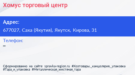 Хомус, торговый центр по адресу 677027, Саха (Якутия), Якутск, Кирова, 31 в дальнейшем Организация, размещена в следующих категориях: